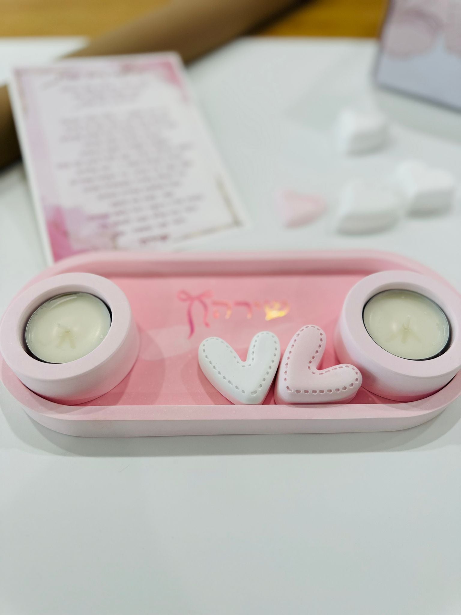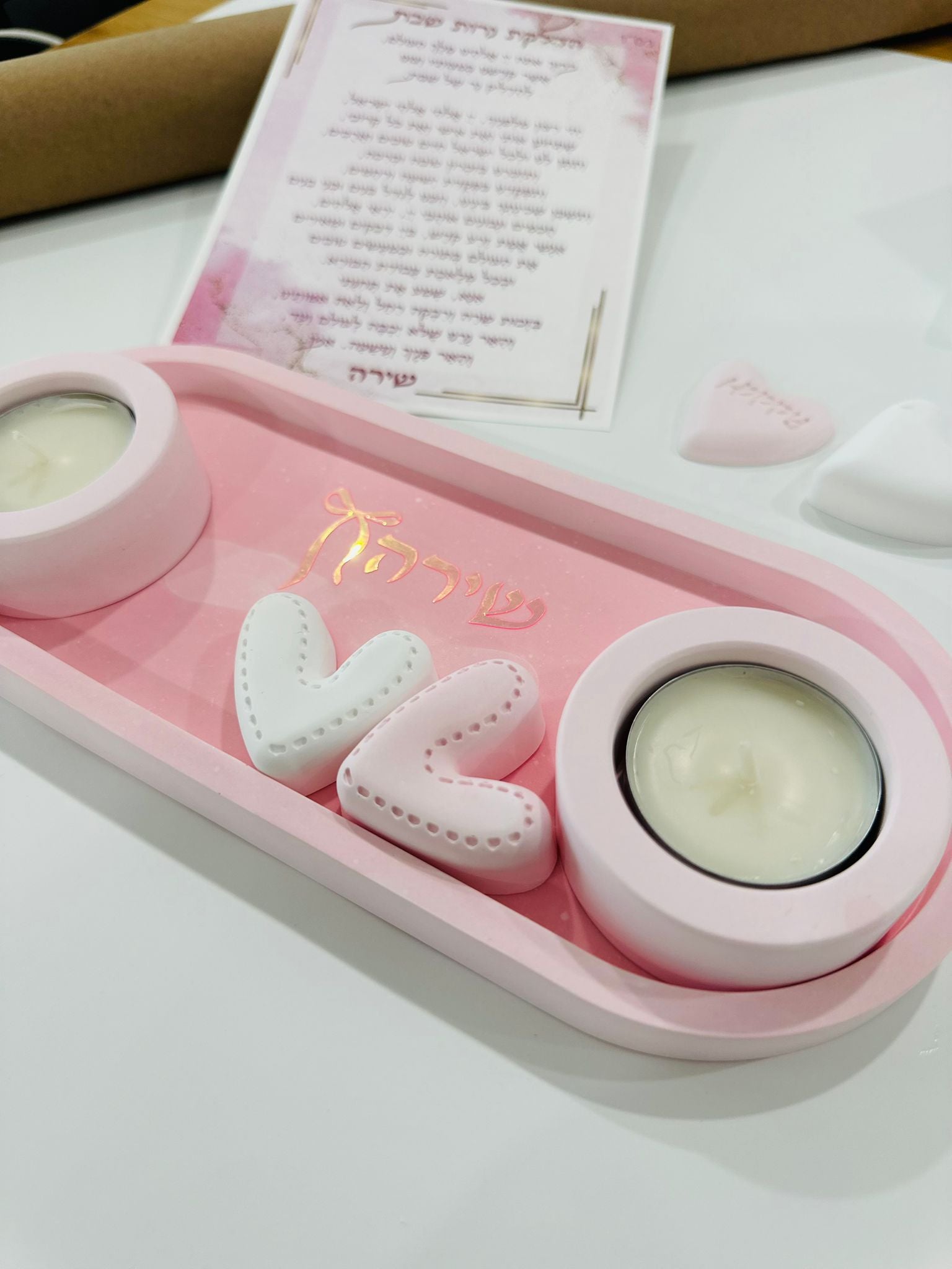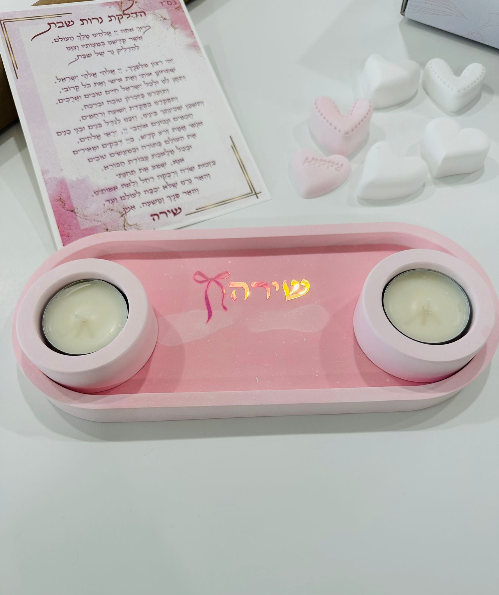 This pink Shabbat candle lighting set is a beautiful handmade Judaica piece designed especially for girls and Bat Mitzvah gifts