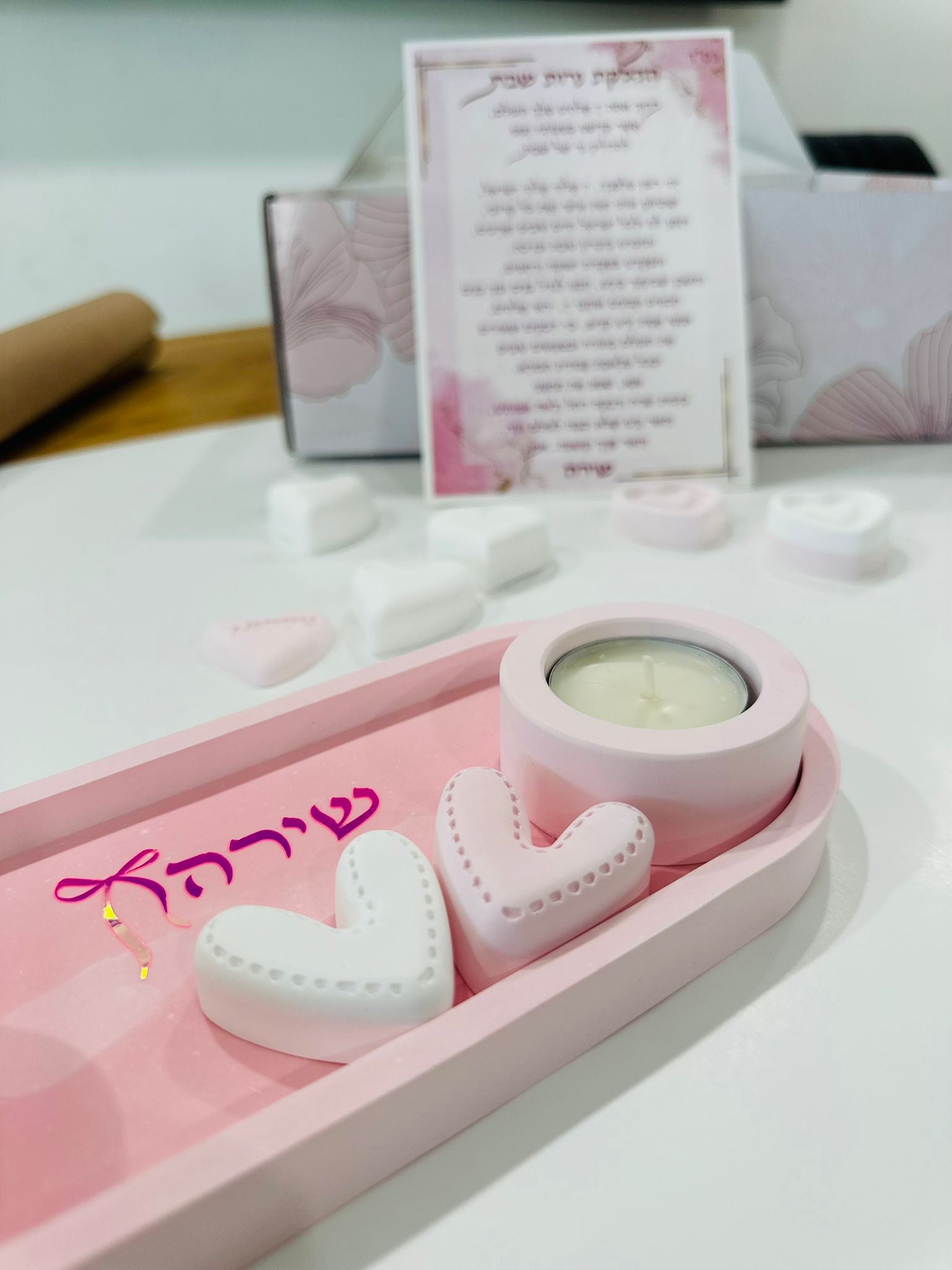It is crafted from durable concrete in a soft pink color and brings both elegance and meaning to the Shabbat table
